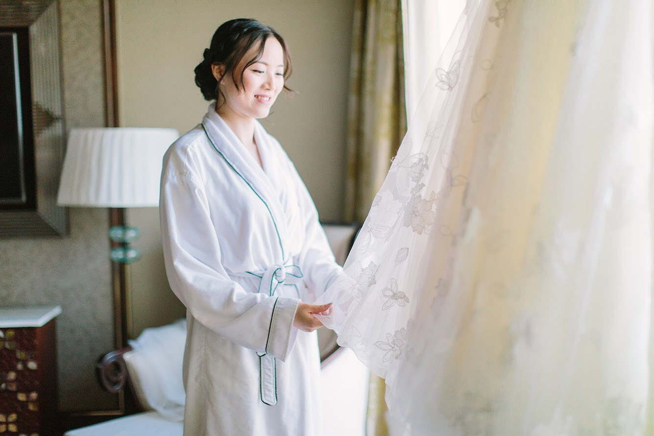 2点多,摄影师Aki的团队也按照之前说好的时间提早到了,那时候我的妆基本搞定,准备开始弄头发,我就像个娃娃一样,索性什么都不想,任凭他们摆弄。Aki的团队有两个摄影,两个摄像,人都非常nice,幽默风趣。他们比我们还了解这个房间,很多小机关,灯光,电控玄关都在他们操控中。一边调光,一边又从哪里变出我的捧花,问我要到戒指,开始了他们的工作。